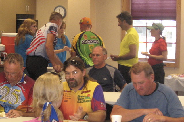 We had pie coming out of our ears yesterday as we hosted a pie stop for the Tour de Nebraska bike riders. A community plea for volunteer pie bakers and pies contributed by our group members netted the thirty pies we needed to satisfy the cravings of the 200 bike riders that passed through our town. The bicyclists, who had already pedaled 45 miles from their overnight campgrounds, starting arriving by 9:30 am. The last of the group left our pie stop by 3:00 pm, so the group was really spread out. In addition to the free will donation basket, the appreciative bikers heaped on the praise as they surveyed the tables covered with many different kinds of delicious-looking pies. Topped with a scoop of ice cream, they seemed to taste as good as they looked. I wouldn’t know for sure, since I didn’t even get a slice myself! After serving pie for nearly six hours, we ran out and had to offer the remaining stragglers ice cream sundaes instead. It was a fun day and a great opportunity to meet lots of very nice people. If you want to read more about the Tour de Nebraska, check out their web site at http://www.tourdenebraska.com/about.html.